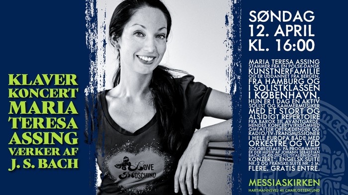 Maria Teresa Assing stammer fra en polsk-dansk kunstnerfamilie og er uddannet fra Bergen, fra Hamburg og i solistklassen i København. Hun er i dag en aktiv solist og kammermusiker med et stort og alsidigt repertoire fra barok til avantgarde. Hendes koncertvirksomhed omfatter optrædender og radio/tv-transmissioner i hele Europa både med orkestre og ved solorecitals. På programmet er der musik af Johann Sebastian Bach. Glæd dig til "Italienisches Konzert", Engelsk Suite nr. 2 og Franske Suite nr. 5 m. flere. Gratis entré.