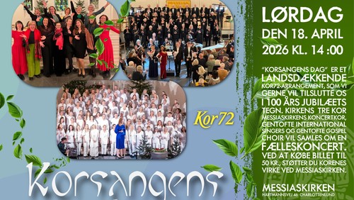 ”Korsangens Dag” er et landsdækkende Kor72-arrangement, som vi gerne vil tilslutte os i 100 års jubilæets tegn. Messiaskirken har tre amatørkor og vi vil samle disse sangglade mennesker til en fælleskoncert. Korene har om formiddagen deltaget i et workshop med korenes dirigenter og med nogle korsange vi gerne vil opføre til koncerten. Publikum kan opleve Messiaskirkens Koncertkor, Gentofte International Singers og Gentofte Gospel Choir hver for sig og også samlet ved denne optakt til jubilæumsfejringen.